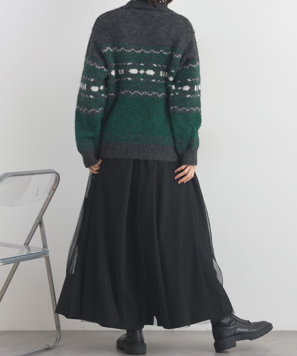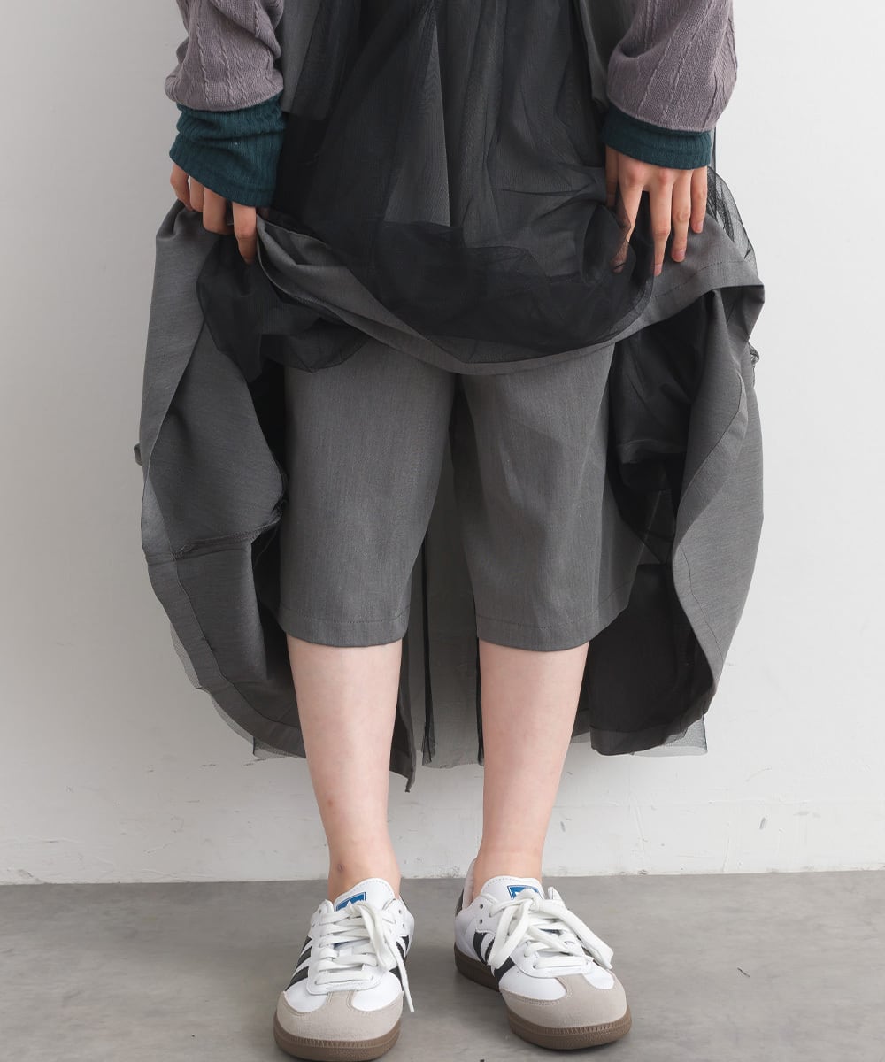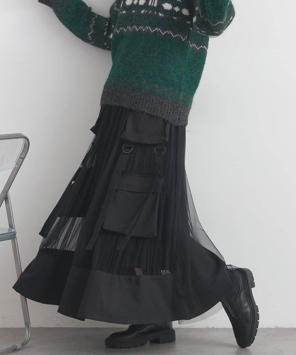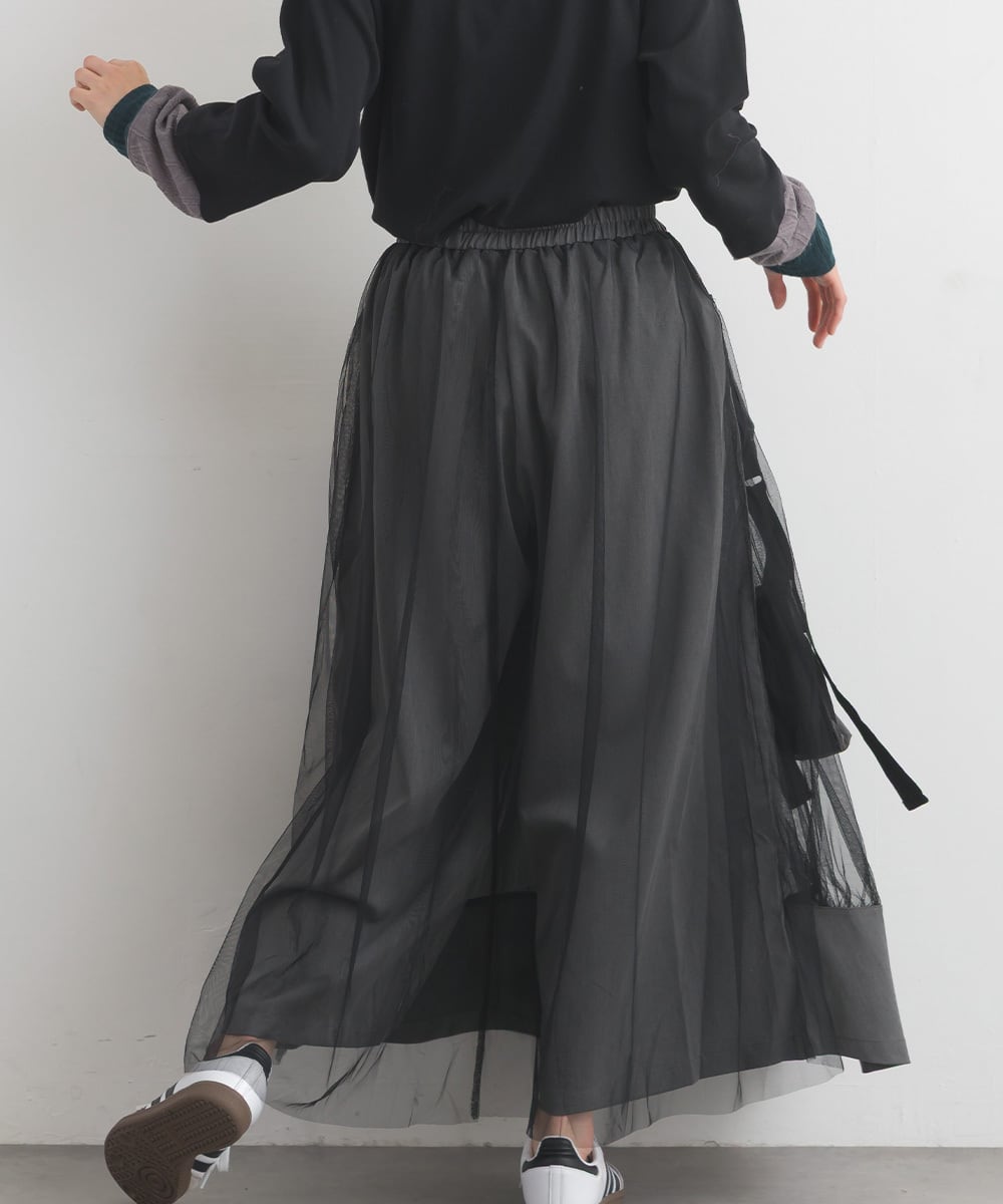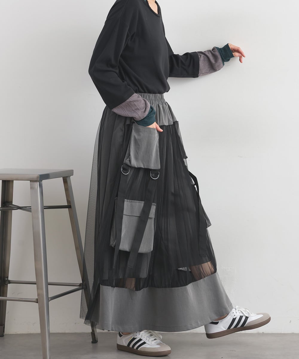 配色切替にチュールを重ね、他にはない雰囲気をまとわせたユーティリティスカート。