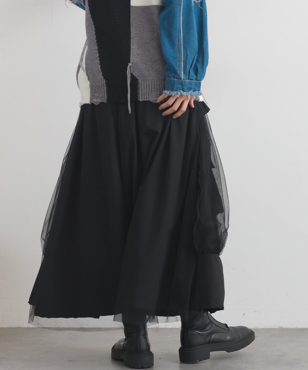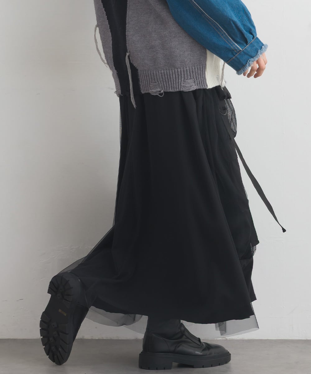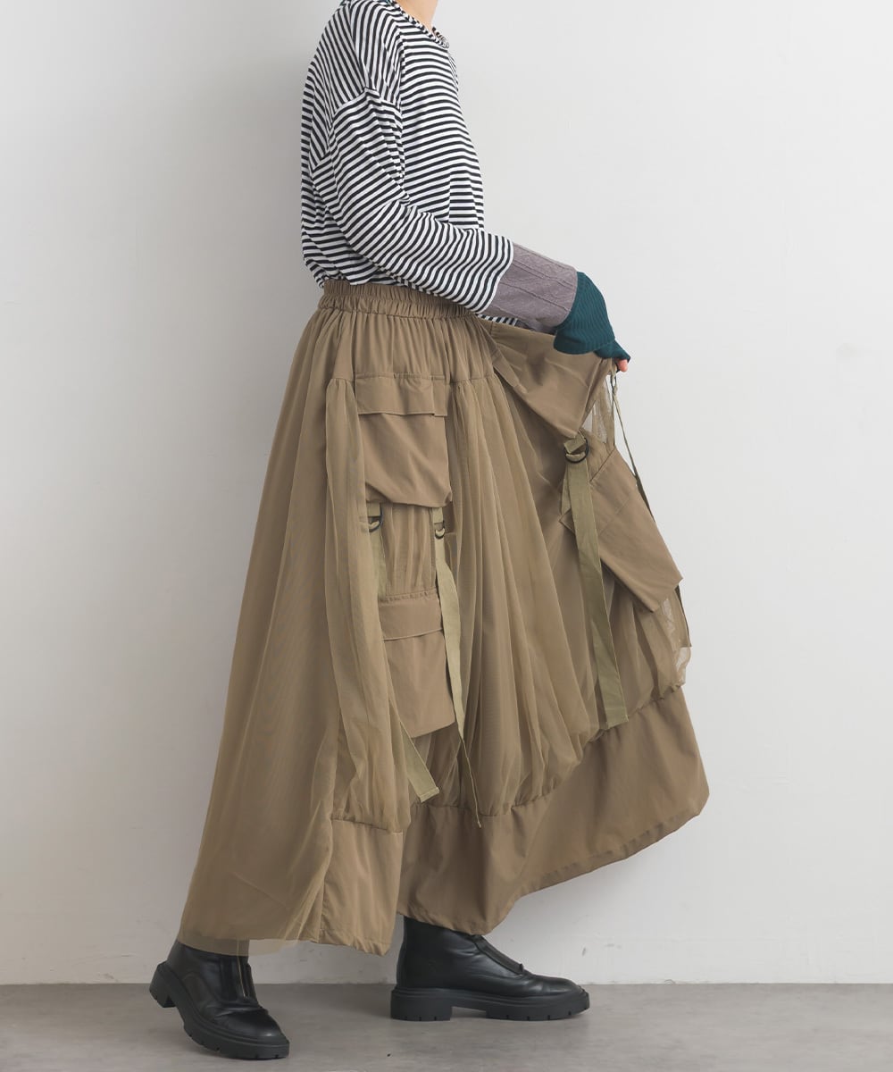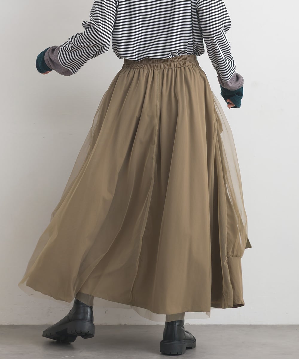 ワークスカートにチュールを重ねた、デザイン性の高い一枚。