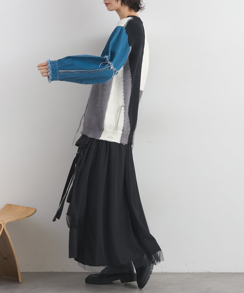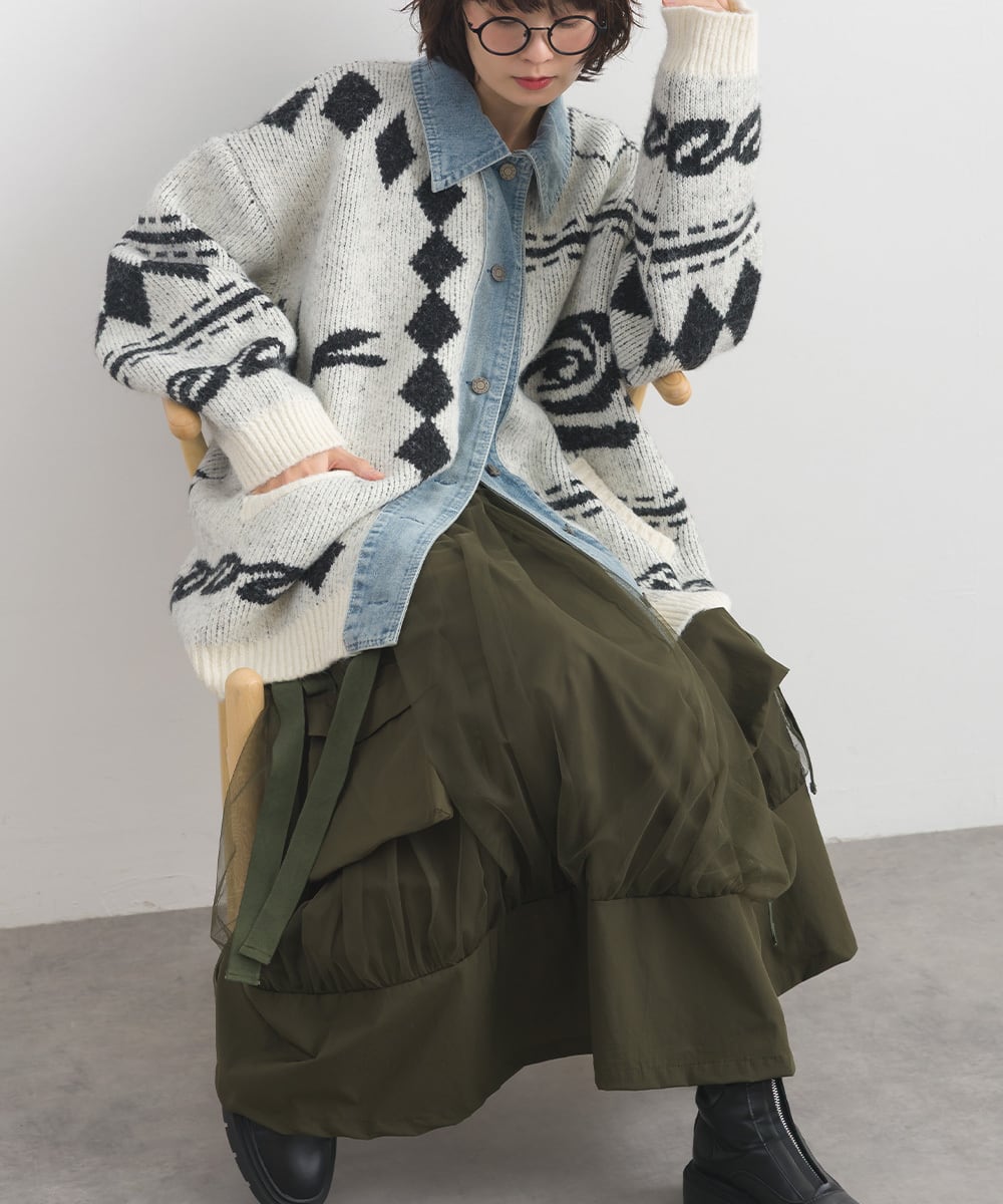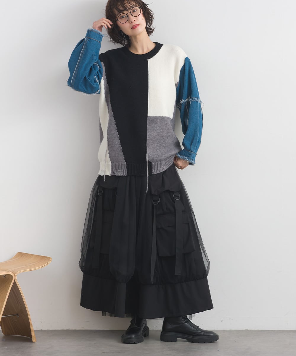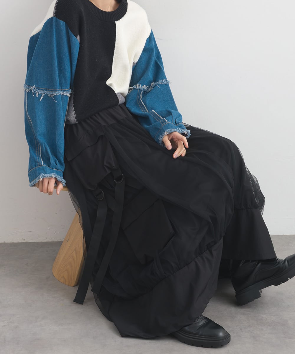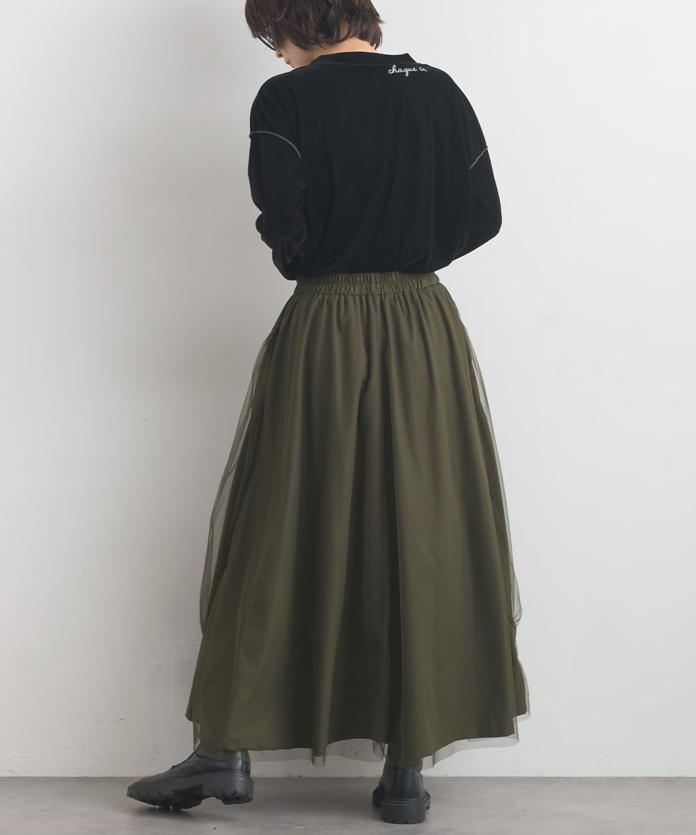 ワークスカートにチュールを重ねた、デザイン性の高い一枚。