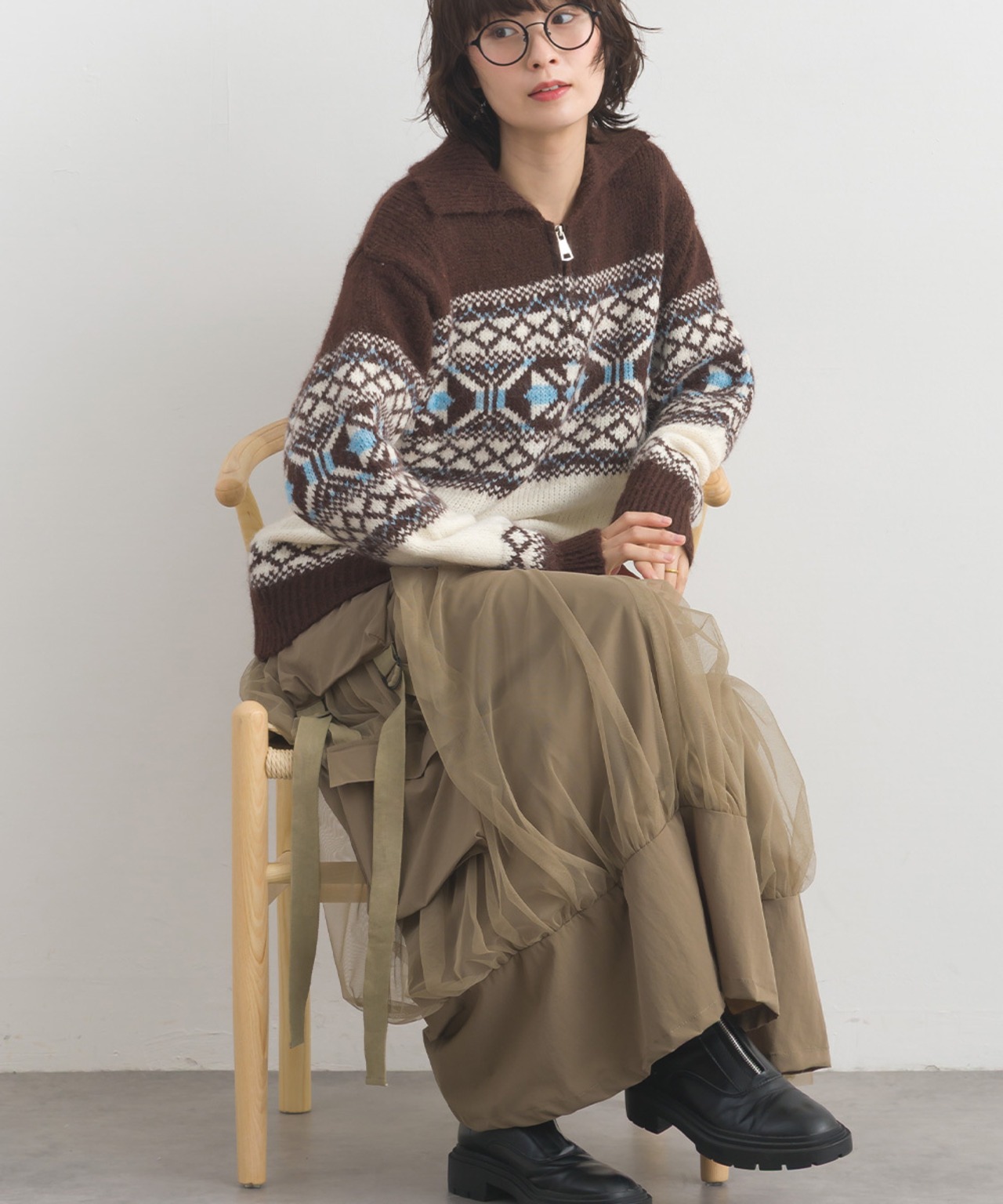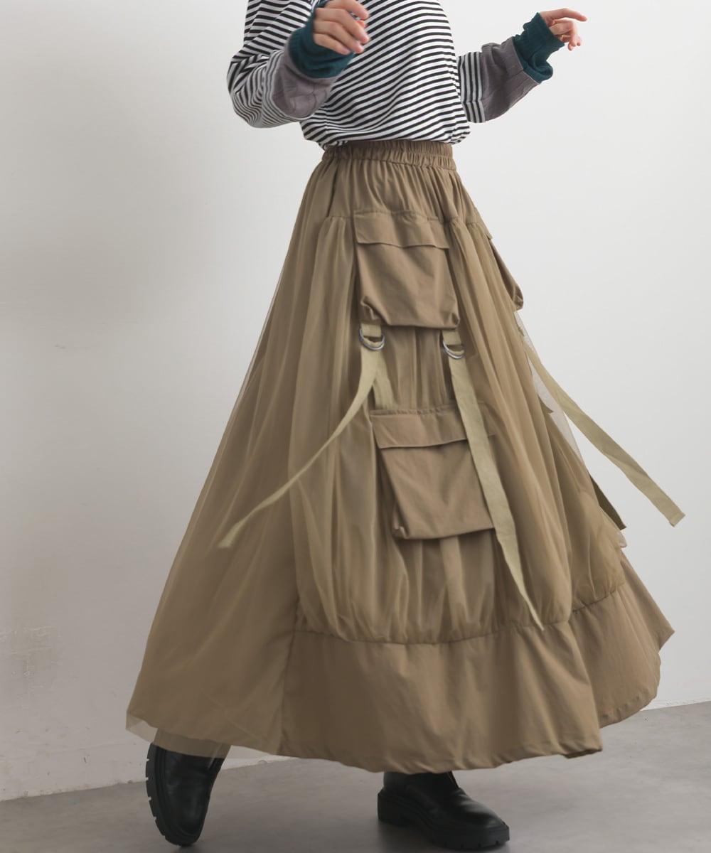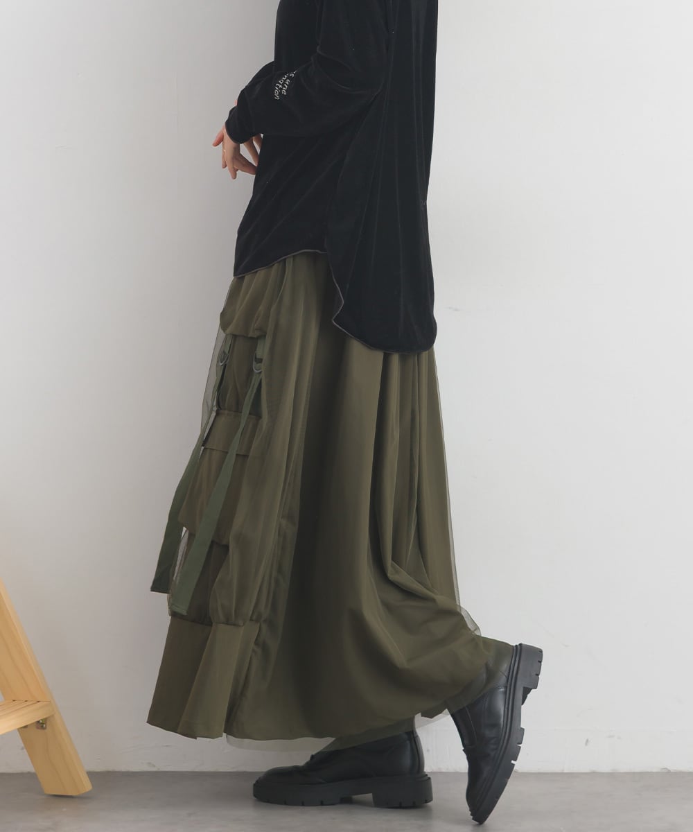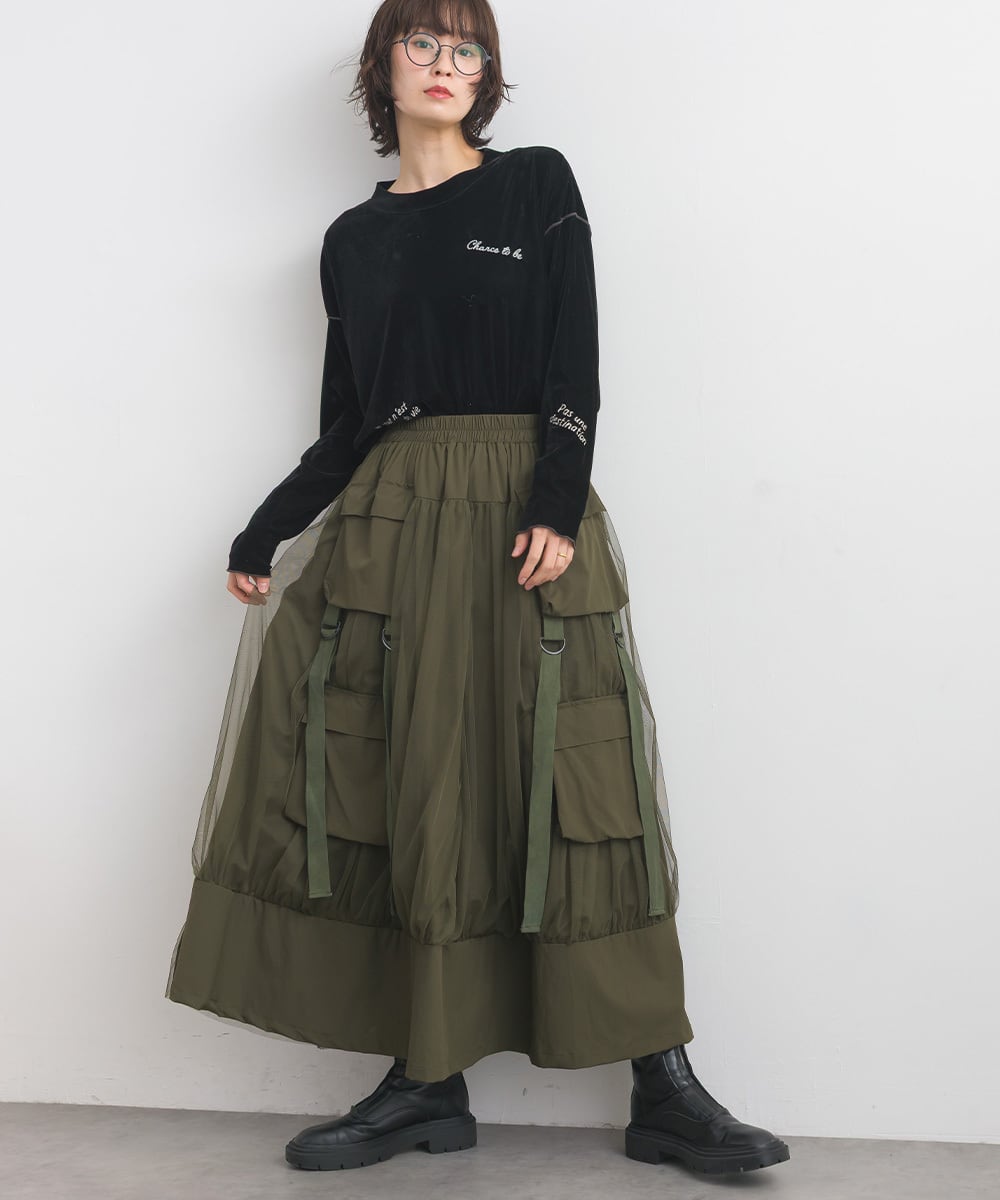 フラップ付きの大きめポケットがワークらしさを演出しつつ、チュールの質感がほんのり女性らしさをプラスします。