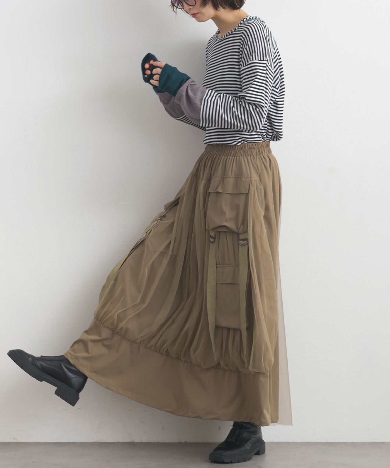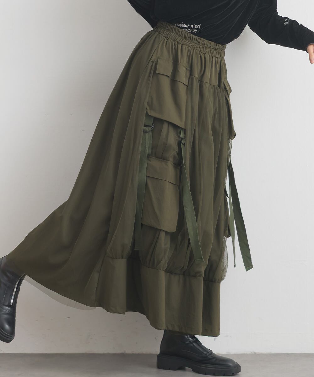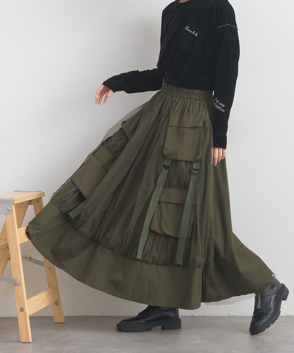 2026SS 2026春夏新作 春夏コーデ オーバーサイズ ワンマイルウエア iriey アイリー カジュアル ナチュラル ミセス ゆったり 体型カバー ゆったりシルエット ワークスカート ミリタリースカート チュールレイヤードスカート カーゴスカート 異素材スカート デザインスカート レディースロングスカート カジュアルスカート 秋冬スカート 春コーデ 総ゴムスカート ボリュームスカート カーキスカート 黒スカート 体型カバー トレンドスカート 大人カジュアル ミリタリースタイル おしゃれスカート