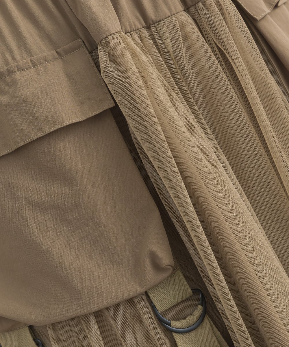 ワークテイストの布帛生地の上に、軽く柔らかなチュールを重ねたレイヤード仕様。