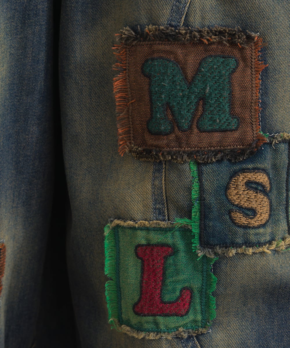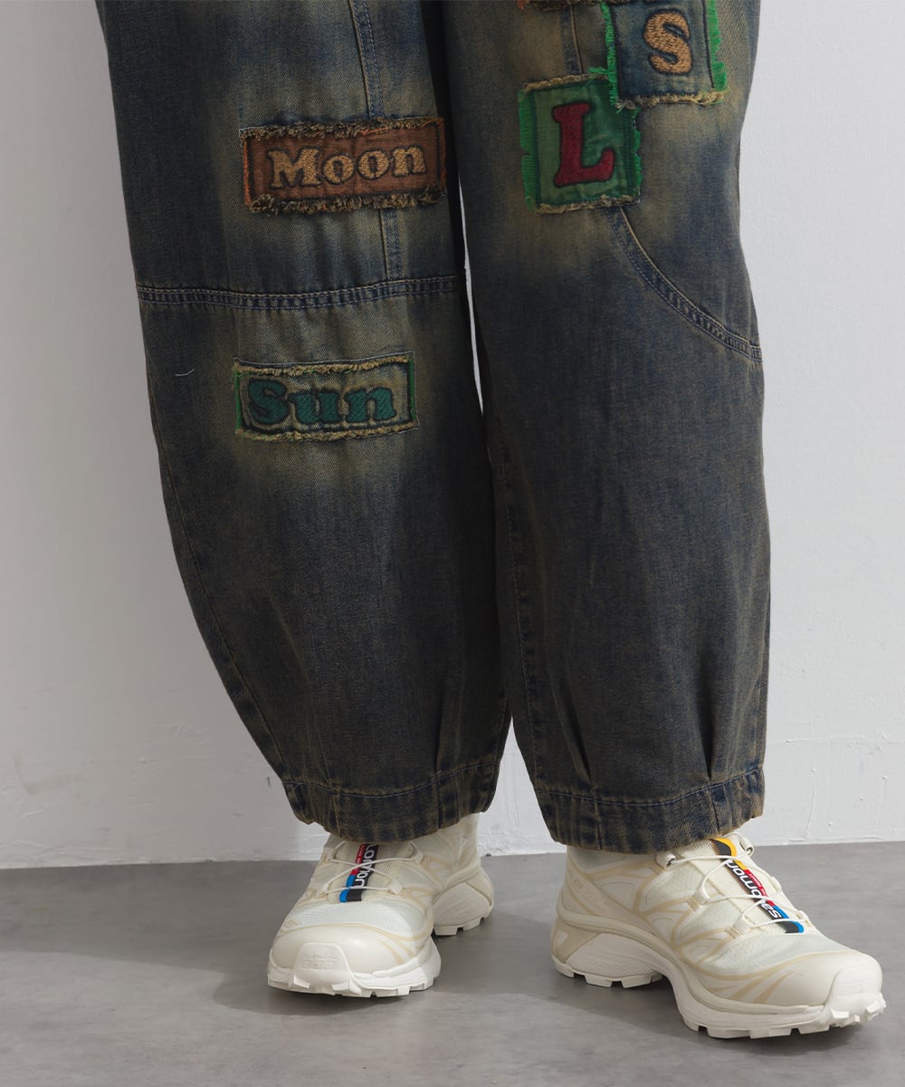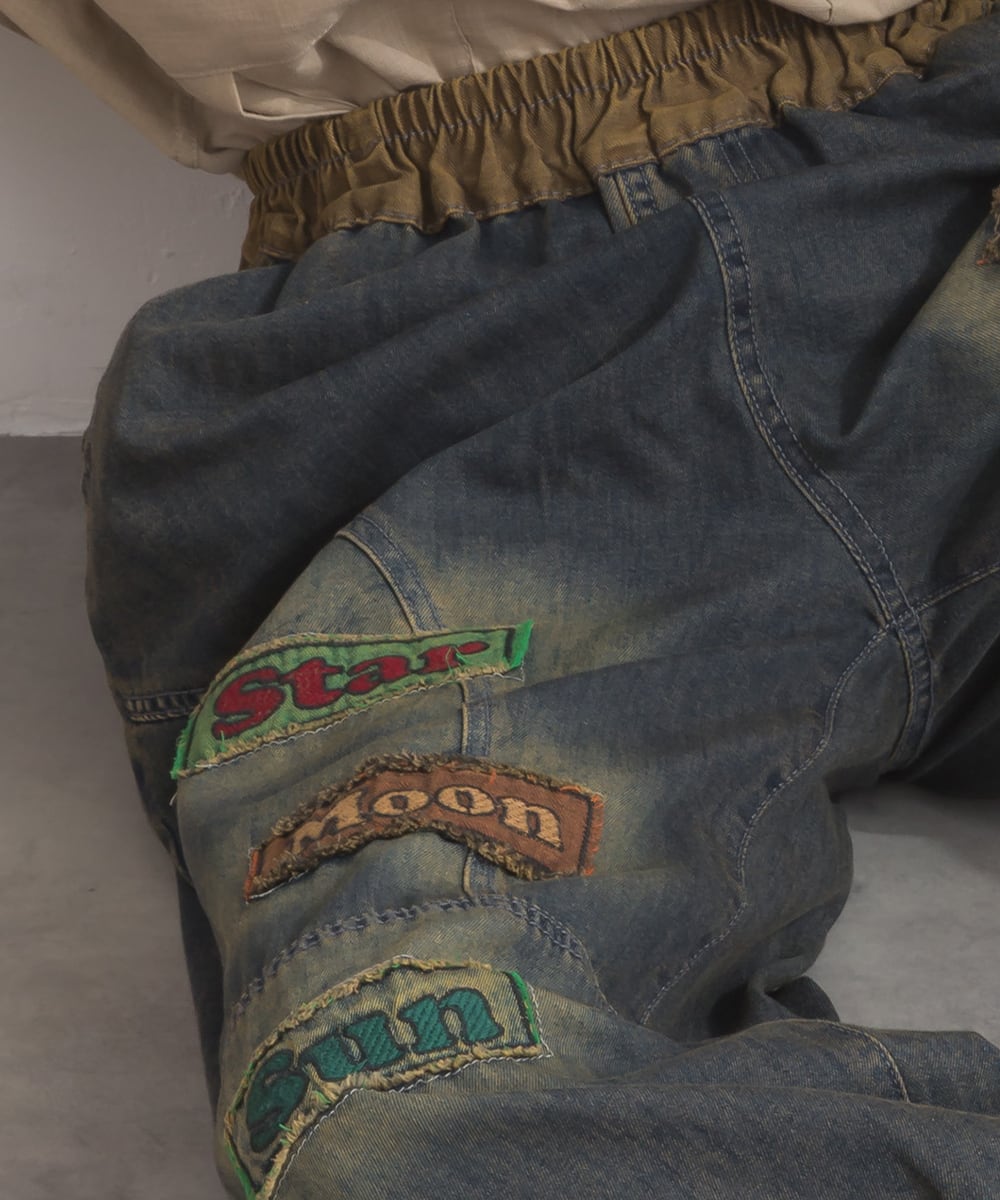 大胆なロゴパッチワークが印象的なデザインデニムパンツ。