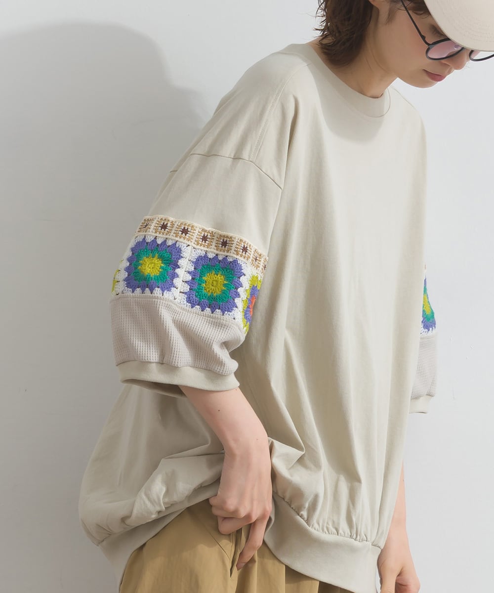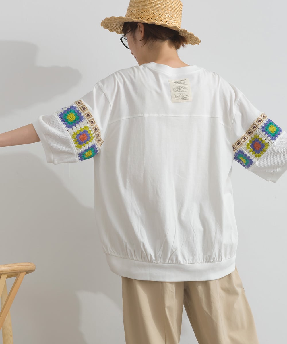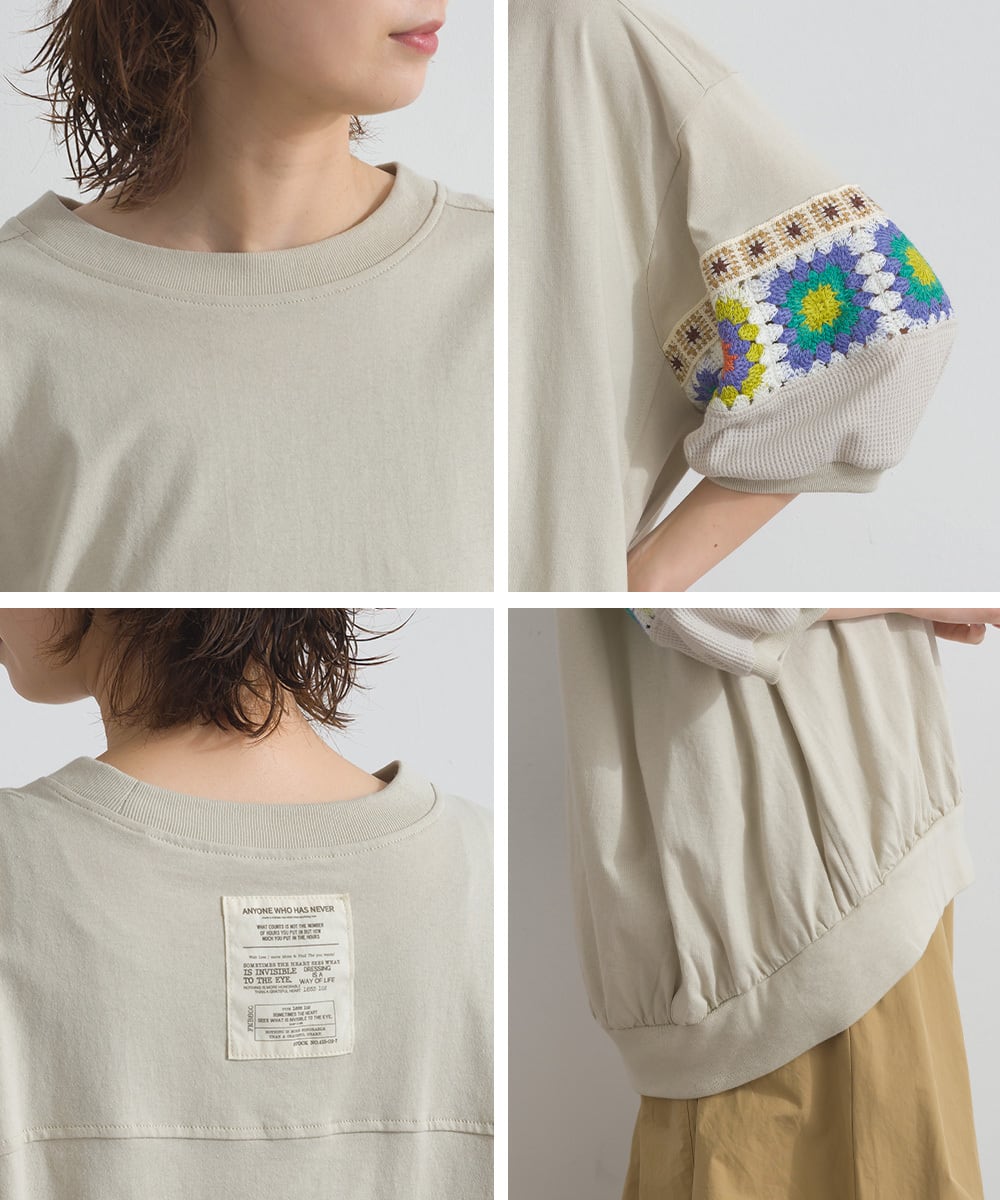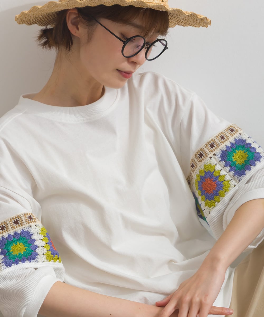 袖のクロシェモチーフデザインが印象的なカットソープルオーバー。