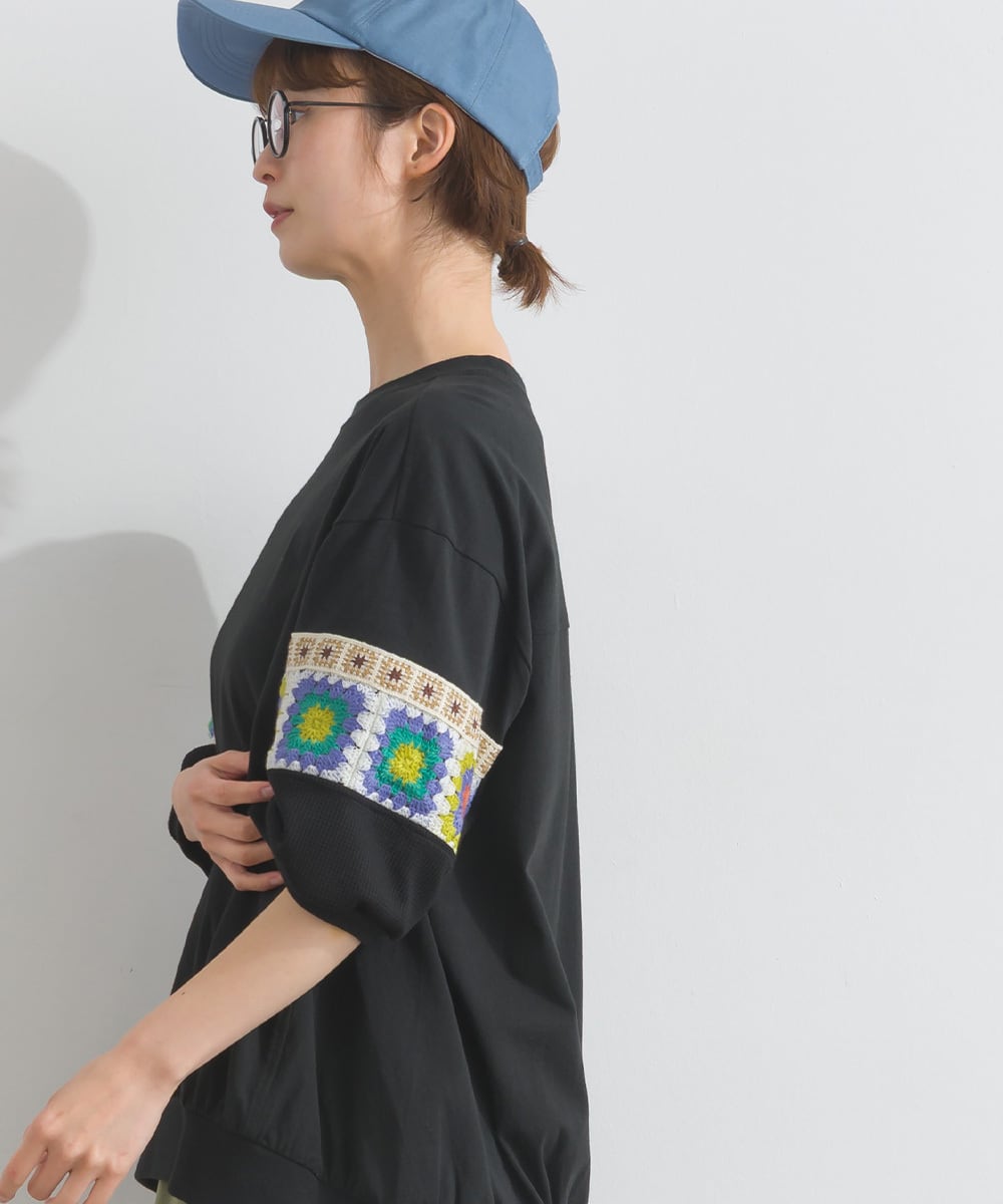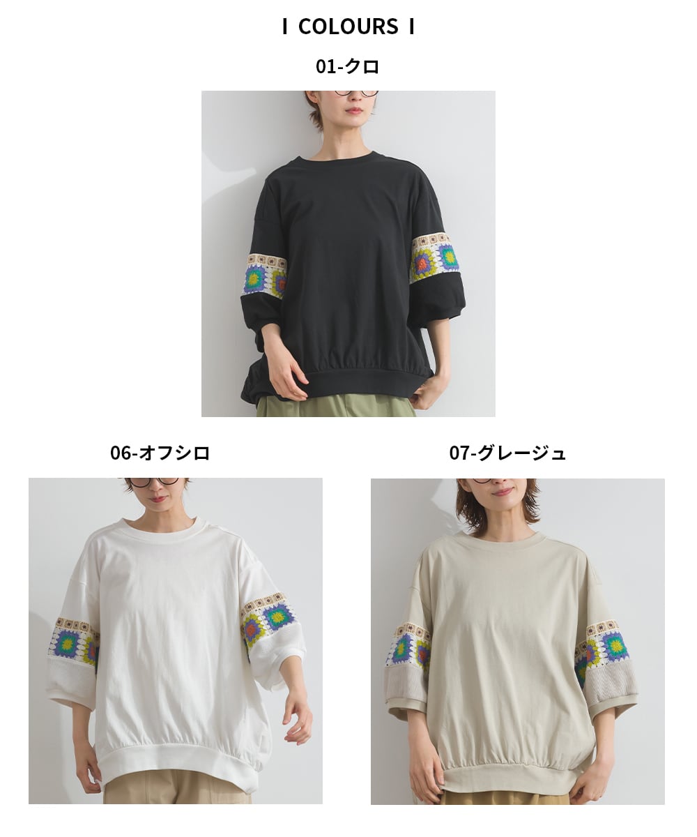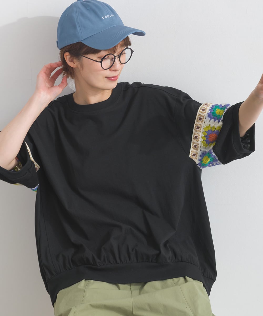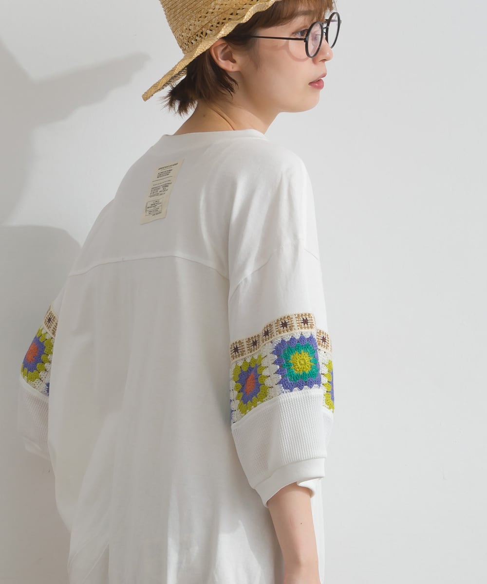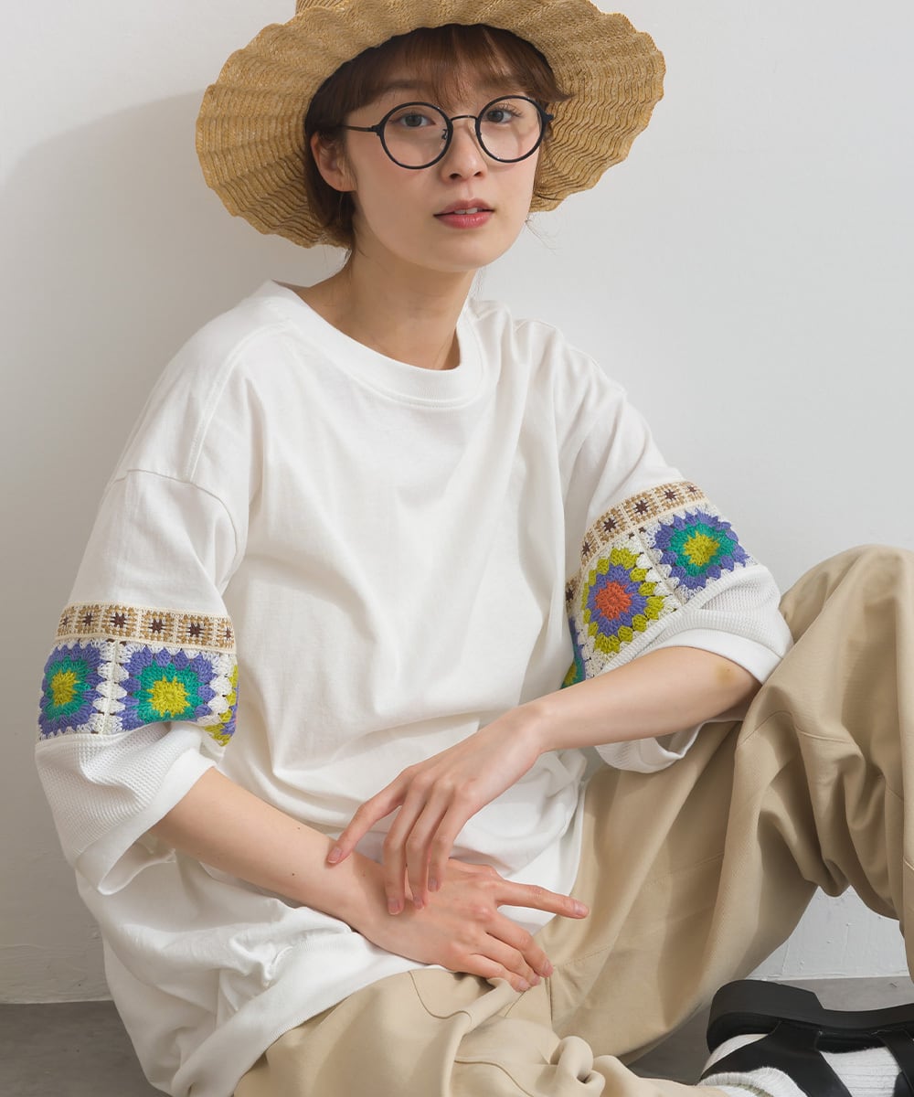 袖のクロシェモチーフデザインが印象的なカットソープルオーバー。