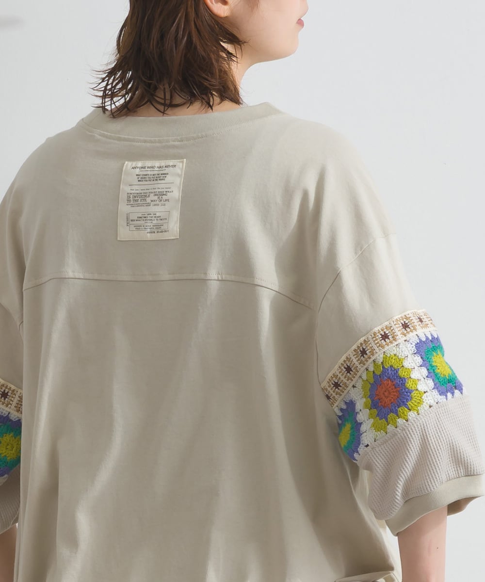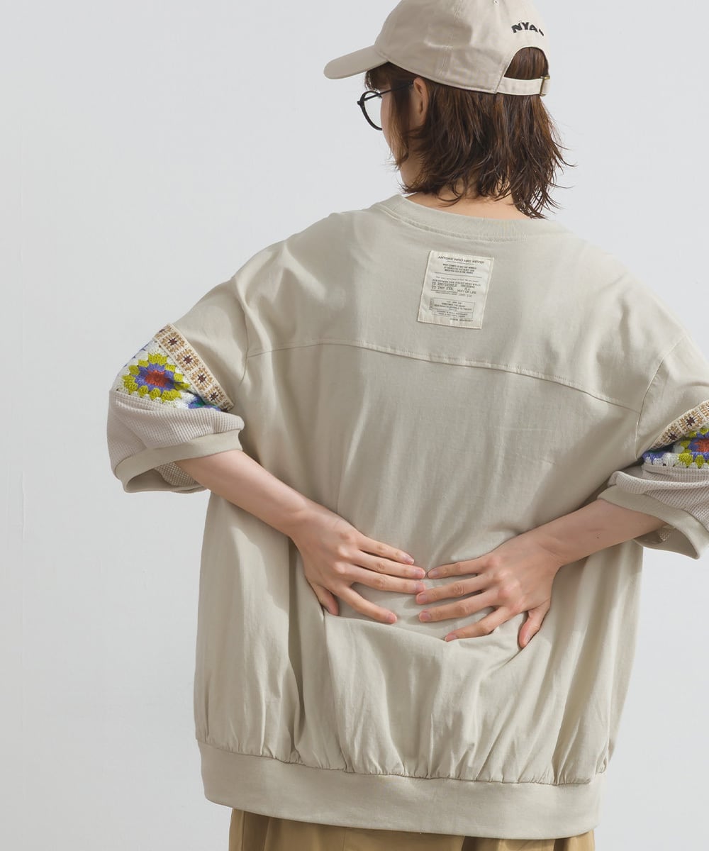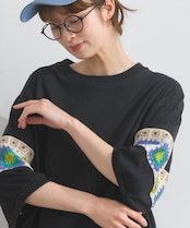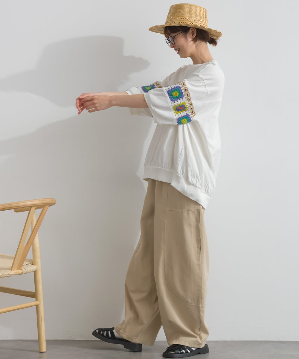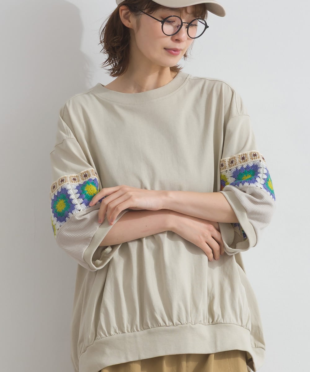 袖のクロシェモチーフデザインが印象的なカットソープルオーバー。
