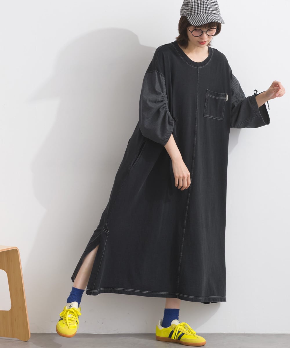袖シャーリングとデニム切替が特徴のデザインワンピース。