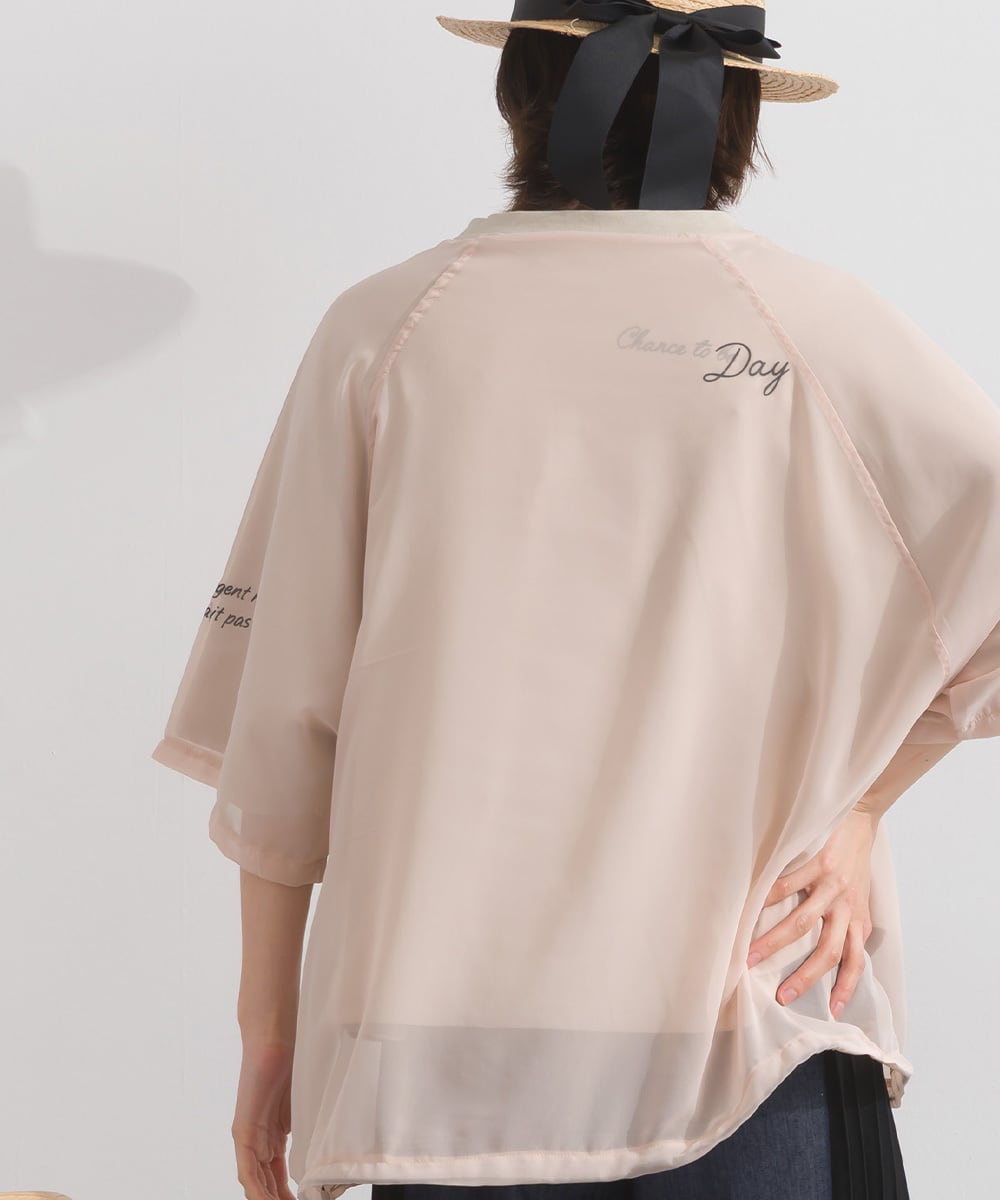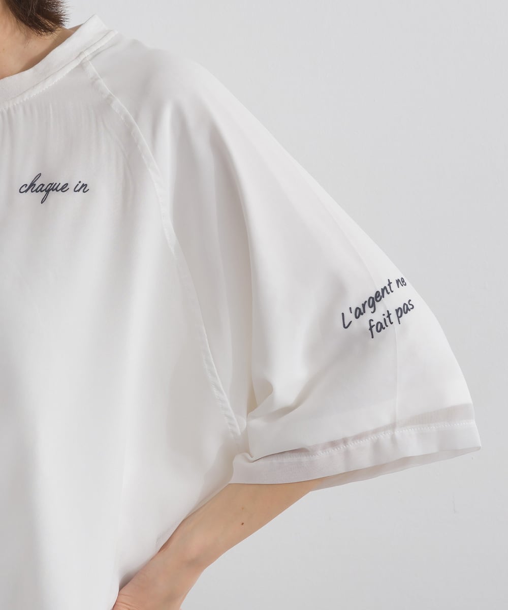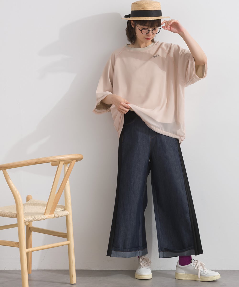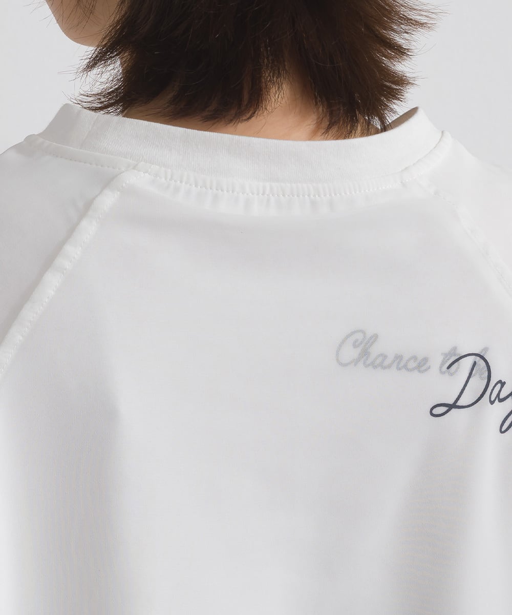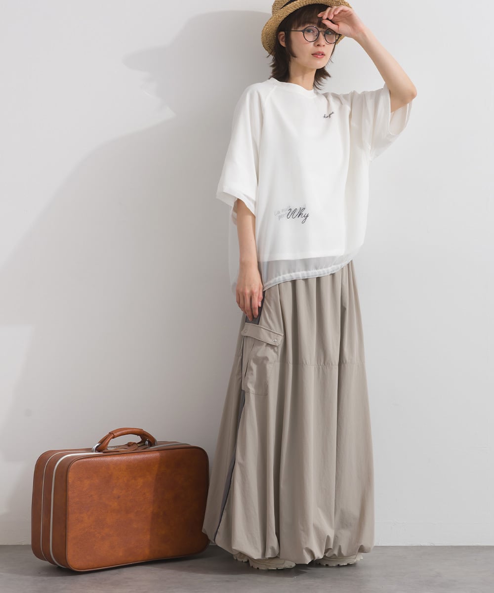 シアー素材を重ねたレイヤード風デザインのTシャツ。