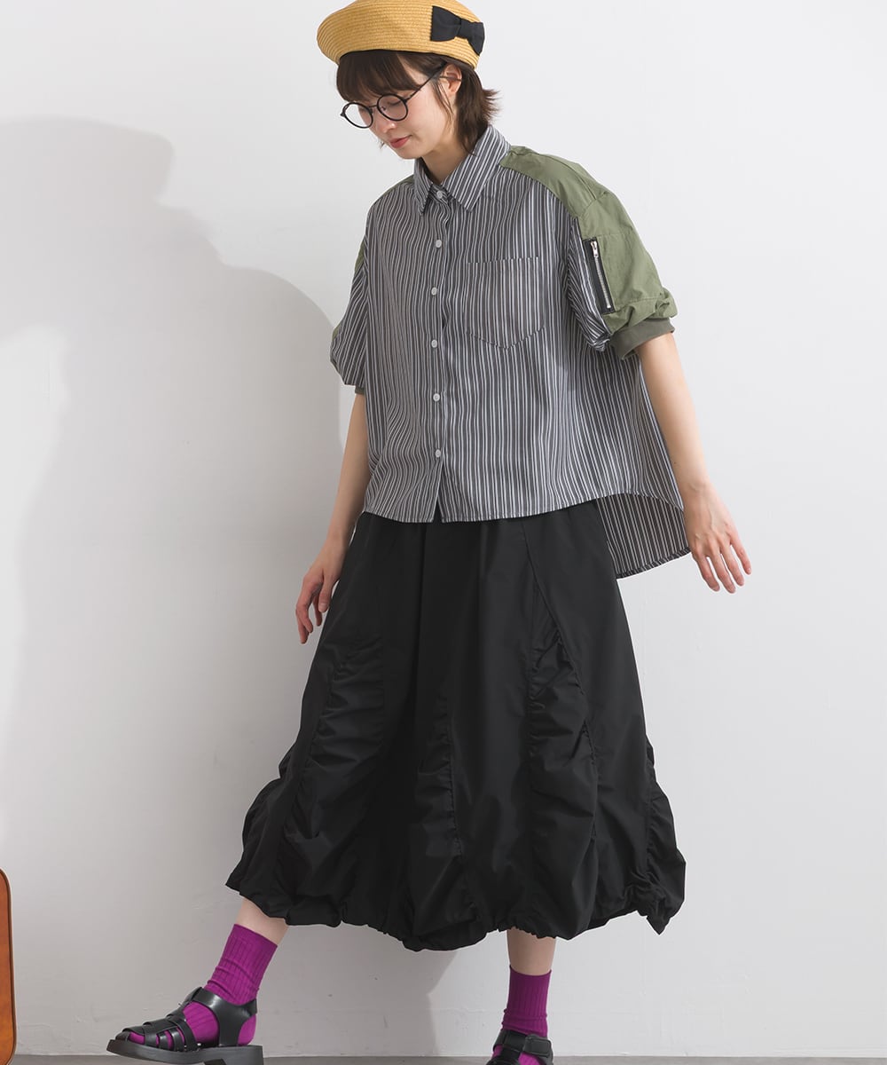 スカートと合わせて女性らしさをプラスしたカジュアルミックススタイルも楽しめます。