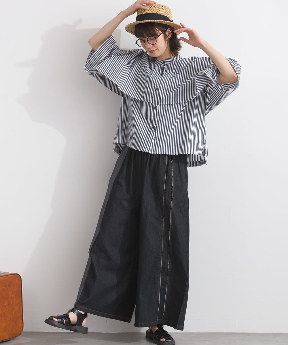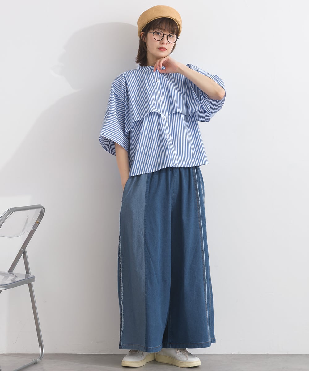 2026SS 2026春夏新作 春夏コーデ オーバーサイズ ワンマイルウエア iriey アイリー カジュアル ナチュラル ミセス ゆったり 体型カバー ゆったりシルエット ワンマイルウェア 大人カジュアル 人気 ストライプブラウス ノースリーブブラウス ケープデザイン レイヤードトップス レディーストップス